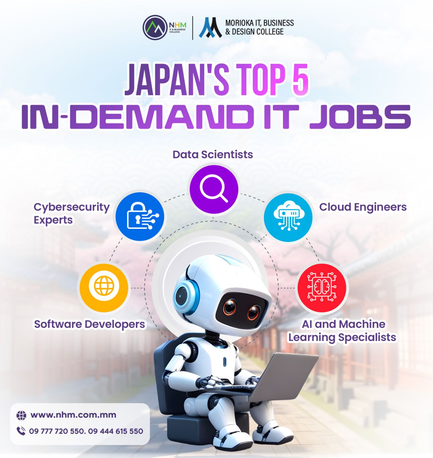 ကျွန်ုပ်တို့ NHM College သည် ကျောင်းသား/သူများတောင်းဆိုမှုကြောင့် ITPEC သင်တန်းကျောင်းကိုလည်း ထပ်မံဖွင့်လှစ်သင်ကြားပေးတော့မှာဖြစ်ပါသည်။ ကျွန်ုပ်တို့ NHM College သည် မြန်မာနိုင်ငံမှာပထမဆုံး ဂျပန်နိုင်ငံအခြေစိုက် IT နည်းပညာရှင်များထွက်ရှိရာ MORIOKA College နဲ့ ပူးပေါင်းပြီး ဂျပန်နိုင်ငံက ကျွမ်းကျင်အတတ်ပညာရှင်များနှင့် မြန်မာနိုင်ငံ အတတ်ပညာရှင်များပူးပေါင်းပြီး ဖွင့်လှစ်သင်ကြားပေး နေပါတယ်။ ကျွန်ုပ်တို့ NHM College ကိုဘာကြောင့်ရွေးချယ်သင့်လဲဆိုရင် မြန်မာနိုင်ငံတွင် မည်သည် ITPEC ကျောင်းများမှ ပေးအပ်ခြင်းမရှိသေးသည် ဂျပန်နိုင်ငံတွင် အလုပ်ရှာရလွယ်ကူစေရန် ဂျပန်နိုင်ငံအသိအမှတ်ပြု Recommendation Letter နှင့် Reference Letter ကို MORIOKA College က ကိုယ်တိုင်ပေးအပ်သွားမှာ ဖြစ်ပါတယ်ခင်ဗျာ။
